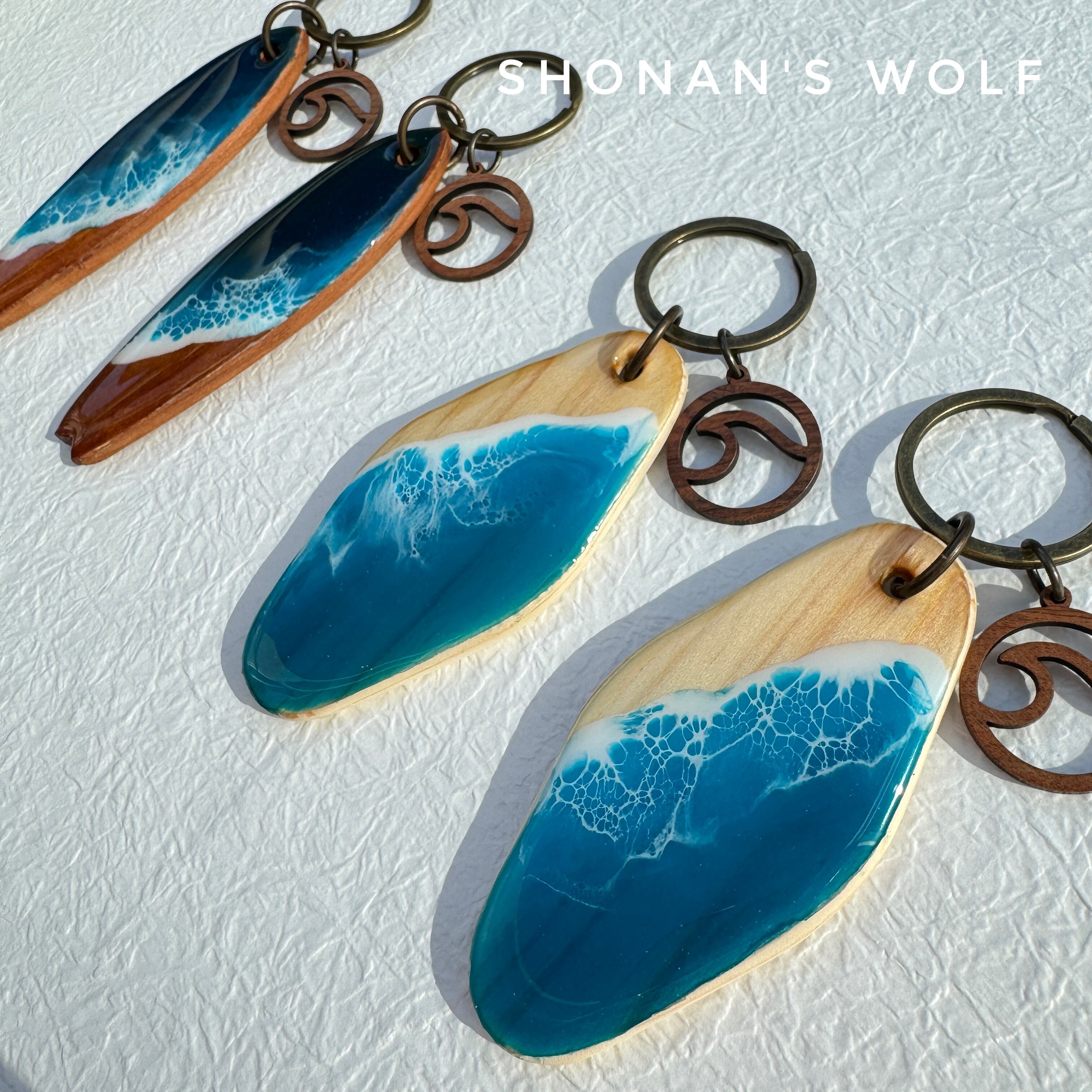 透明感のあるレジン素材を使用して海と白波を表現しました。キーリング部分には、真鍮カラーが上品なアクセントとなります。